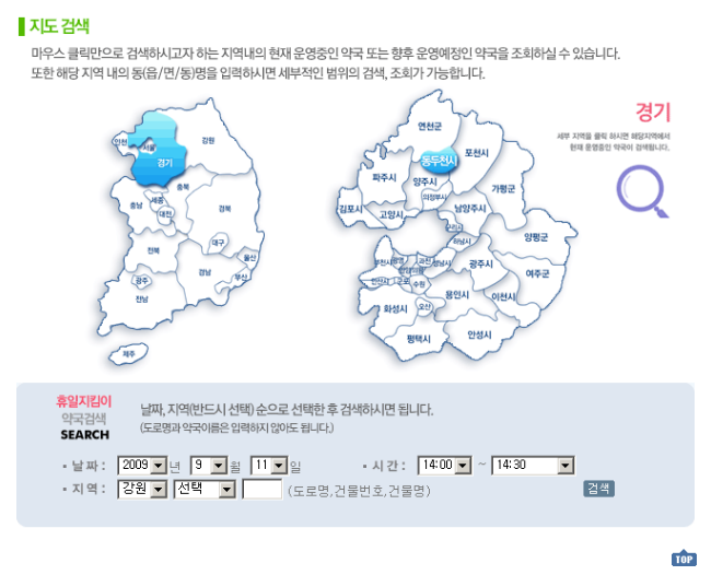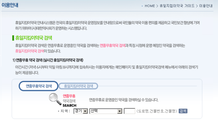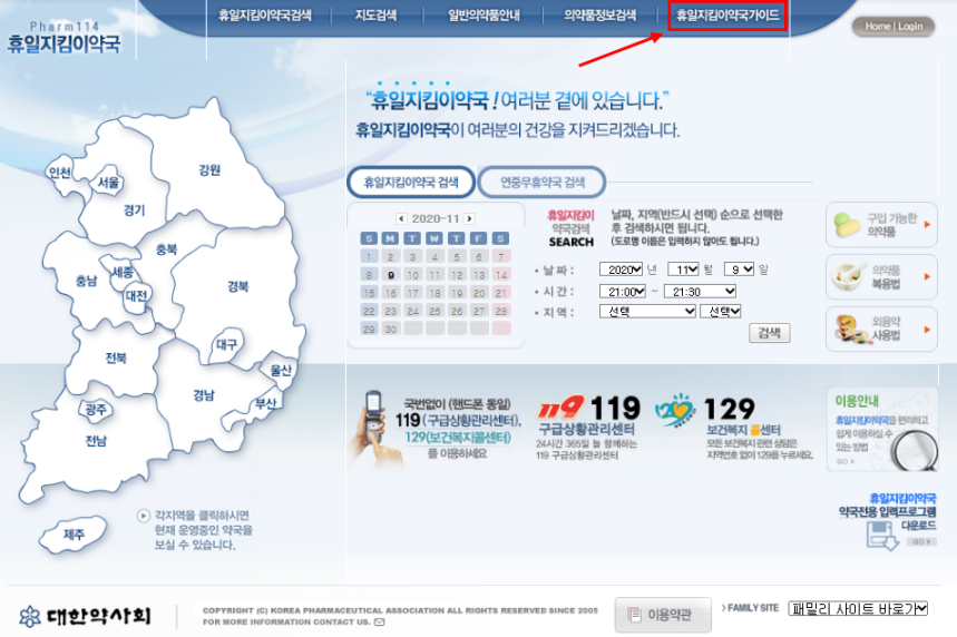 휴일지킴이 약국 홈페이지에서 휴일지킴이 약국 가이드를