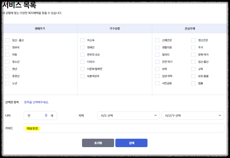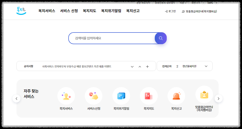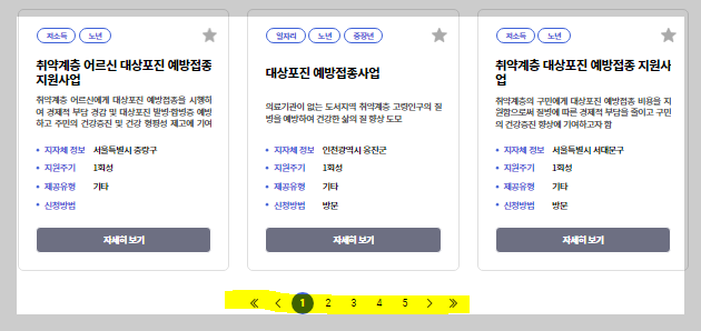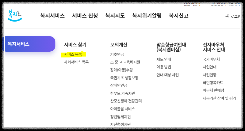 첫번째 복지서비스에 커서를 가까이 대면 다음 화면이 나옵니다
