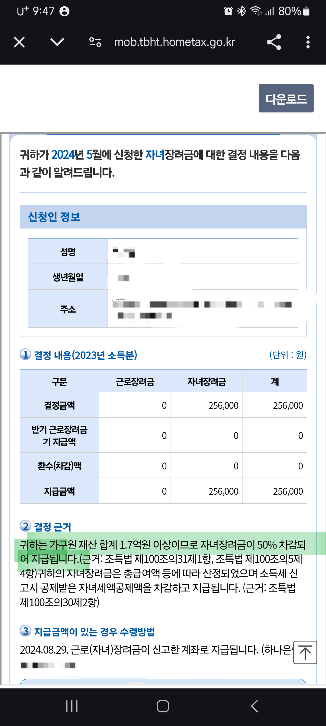 가구원 합계 재산이 1억7천만원 이상이라고 해서 자녀장려금이