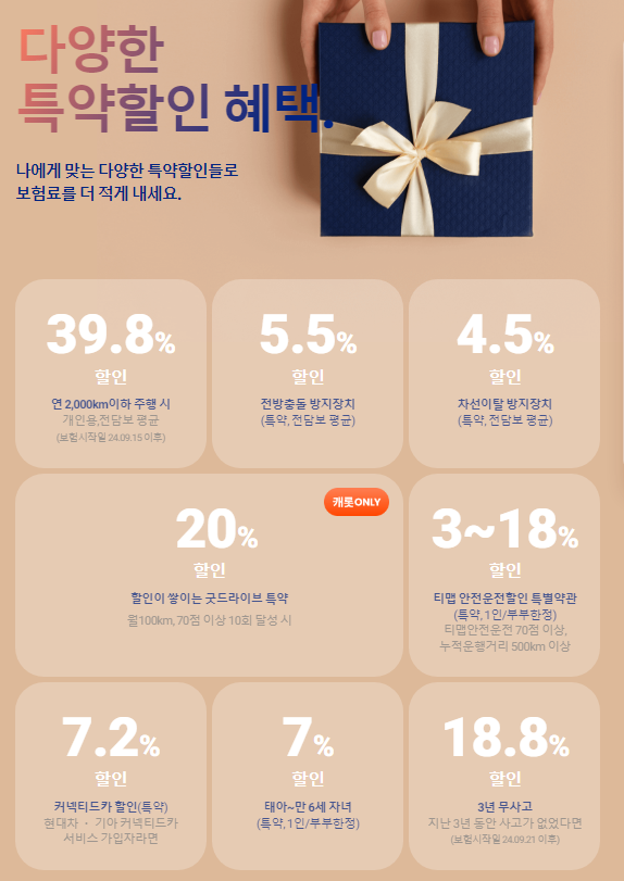 - 운전 습관: 캐롯 플러그를 통해 수집된 운전 습관 데이터(급가속, 급정지 등)에 따라 추가 할인 혜택이 적용될 수 있습니다.