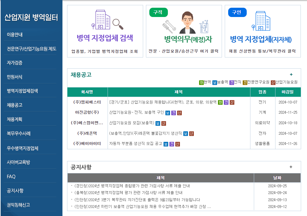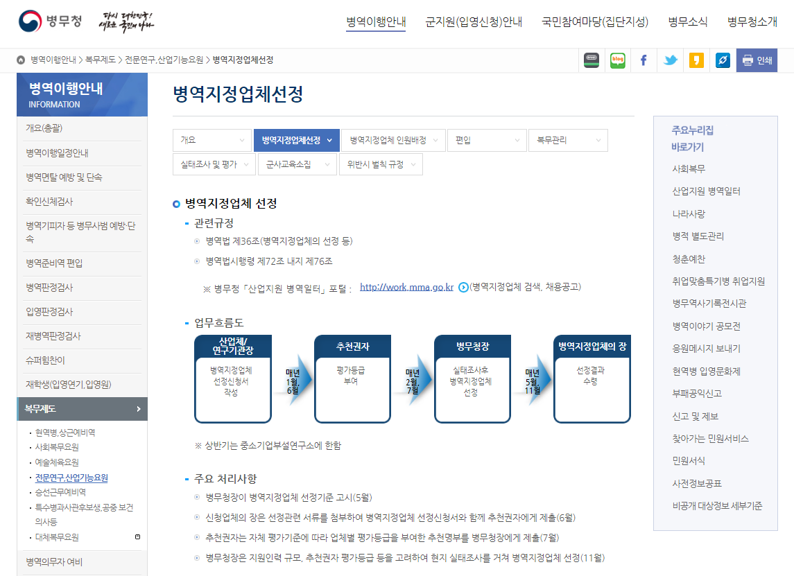 산업기능요원 신청자는 병무청에서 인정한 병역특례 지정업체에 취업해야 합니다. 병무청은 매년 지정업체 목록을 공개하며, 해당 업체에 고용된 상태여야 신청이 가능합니다.