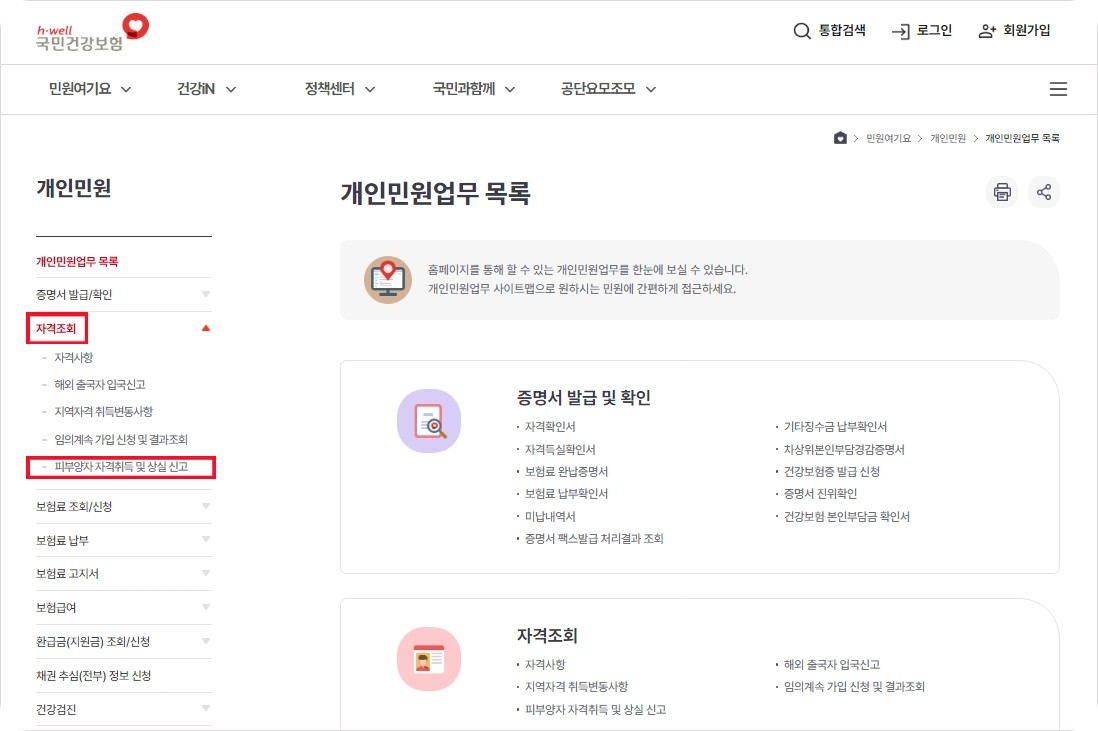 - 민원 종류 중 '피부양자 자격 취득(상실) 신고'를 선택합니다.