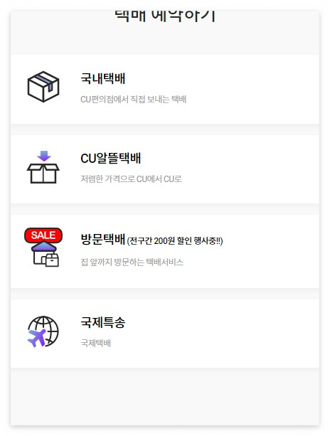 A: 현재 CU는 국내 택배 서비스만 제공하고 있습니다.