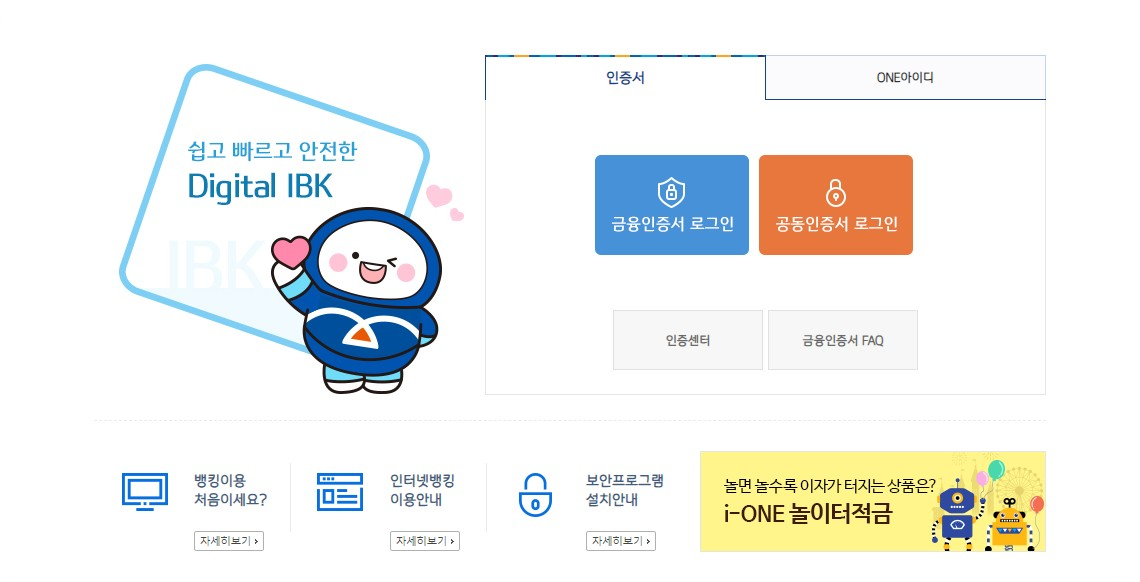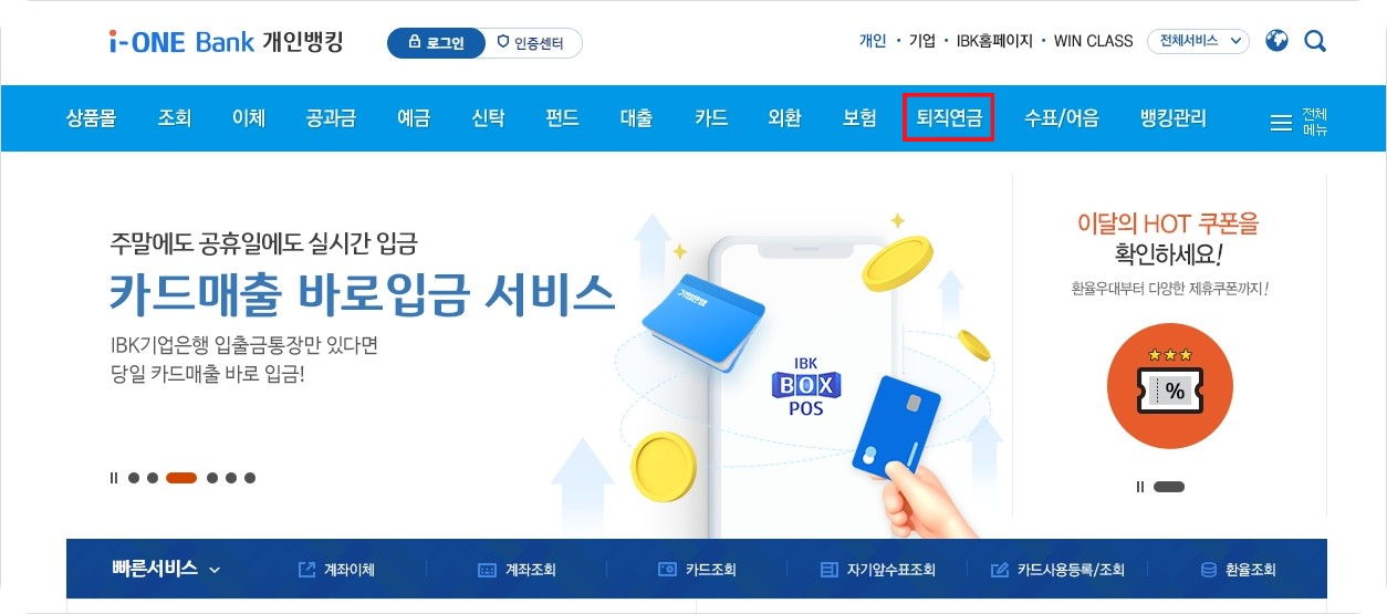 기업은행 인터넷뱅킹 또는 i-ONE 뱅크 앱에 로그인 후 "퇴직연금" 메뉴로 이동합니다.