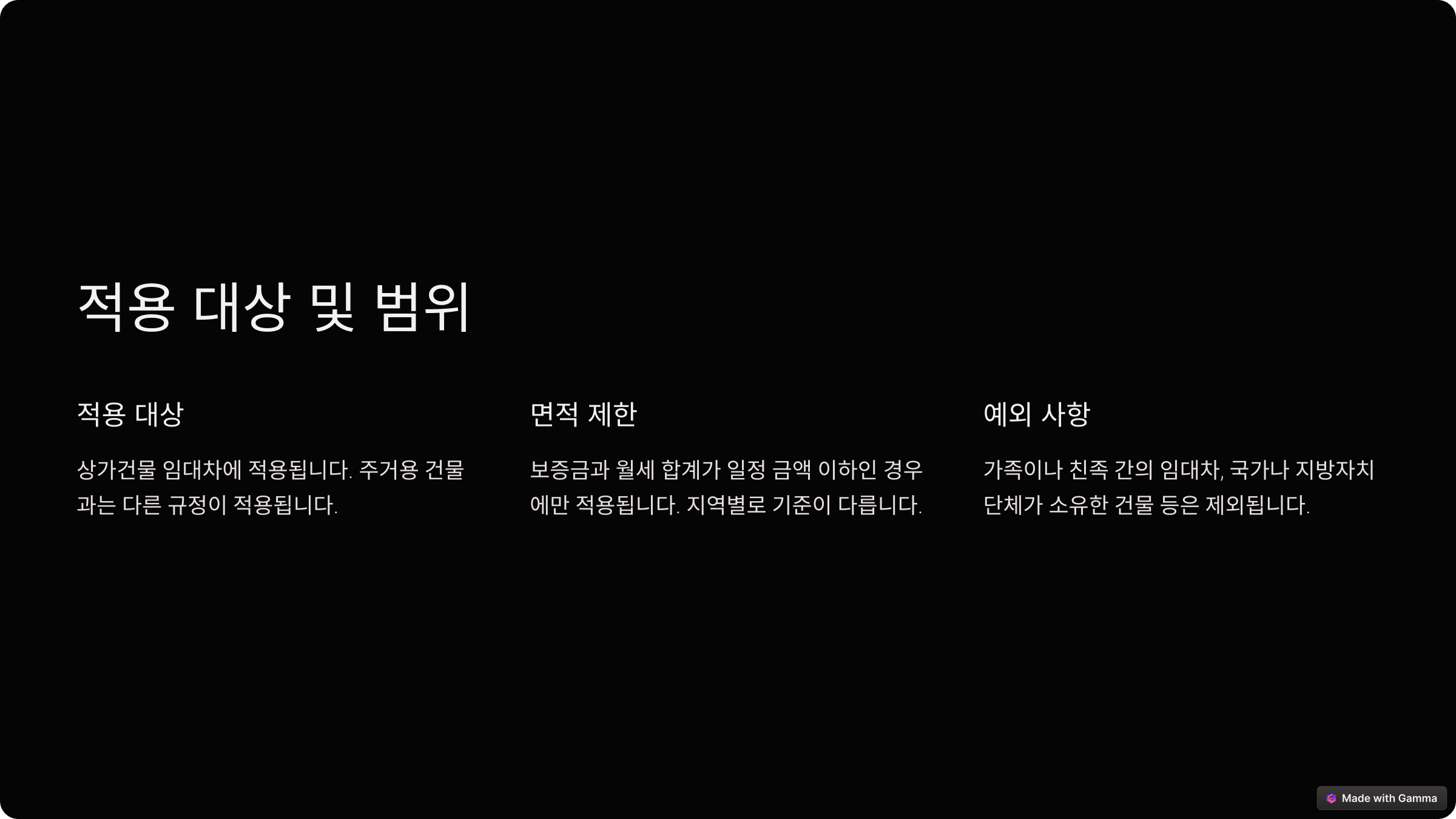 법률은 보증금과 월세를 합산한 금액이 일정 한도를 초과하는 경우에는 적용되지 않습니다. 이 한도는 지역별로 다르게 설정되며, 서울과 같은 대도시와 지방 소도시 간에 차이가 있습니다. 예를 들어, 대도시에서는 높은 임대료 환경을 반영해 더 높은 기준이 적용됩니다.