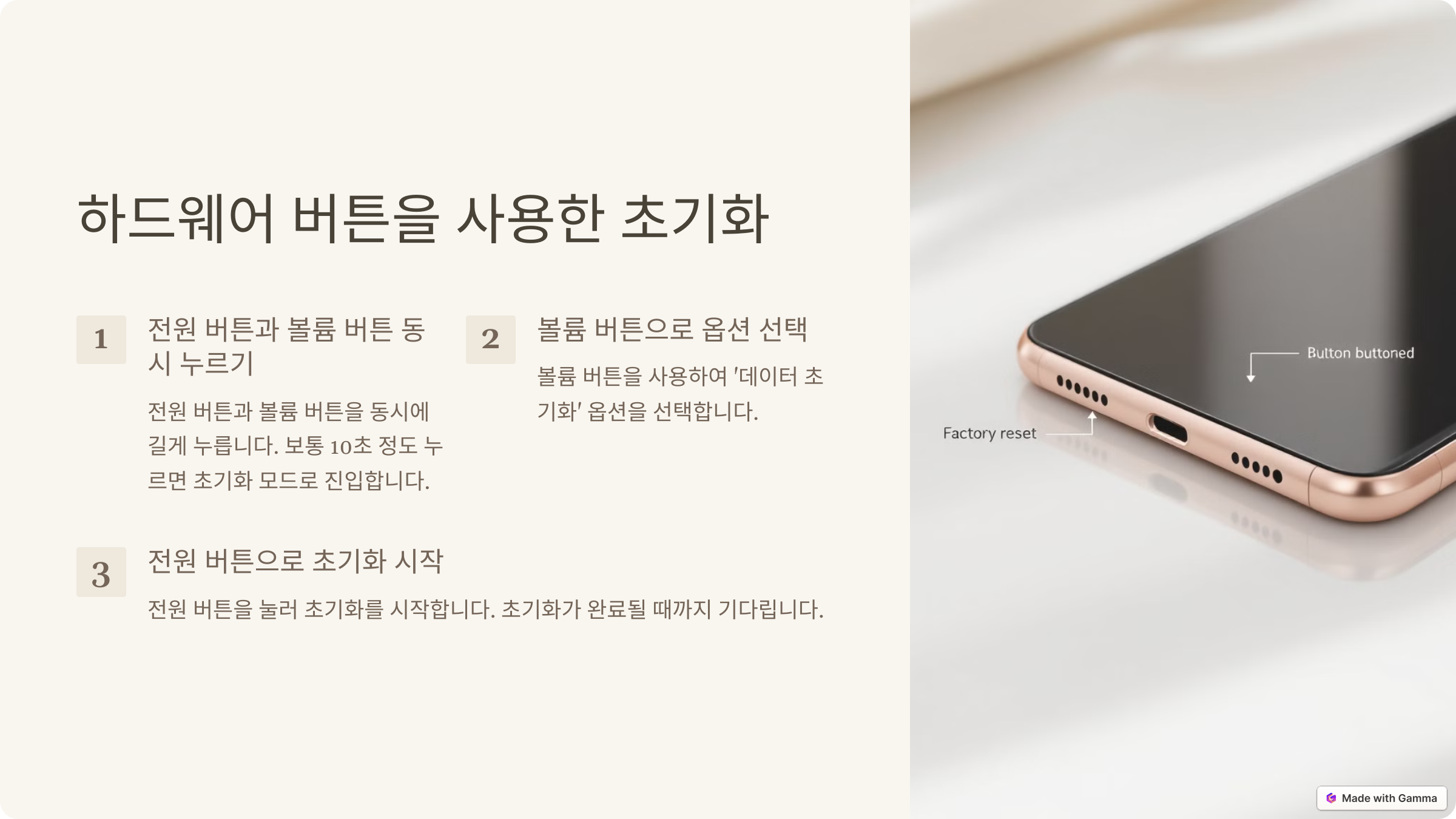 스마트폰이 정상적으로 작동하지 않아 "설정" 메뉴에 접근할 수 없을 경우, 하드웨어 버튼을 사용하여 초기화를 진행할 수 있습니다. 이 방법은 부팅 문제가 있는 경우 유용합니다.