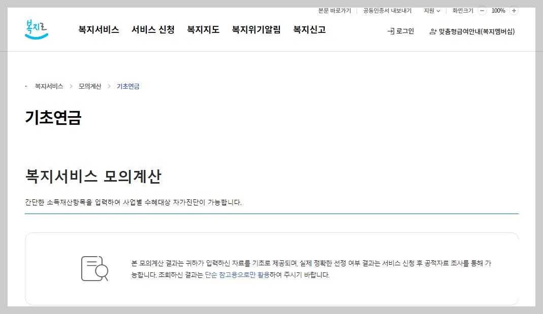 - 국민연금공단 접속 후, 상단 메뉴에서 "복지 서비스 → 기초연금 모의계산" 항목을 선택합니다.