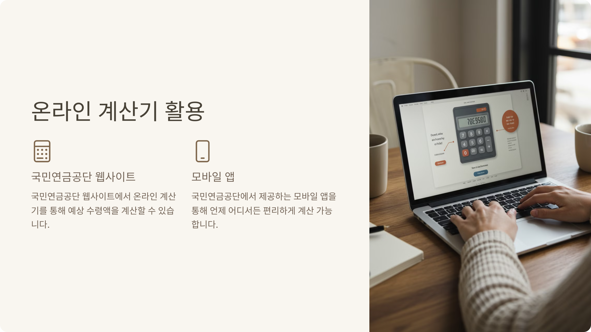 국민연금공단은 예상수령액을 빠르고 간편하게 확인할 수 있는 온라인 계산 도구를 제공합니다. 이를 통해 개인의 소득 및 납부 이력을 기반으로 한 정확한 연금 수령액을 추정할 수 있습니다.
