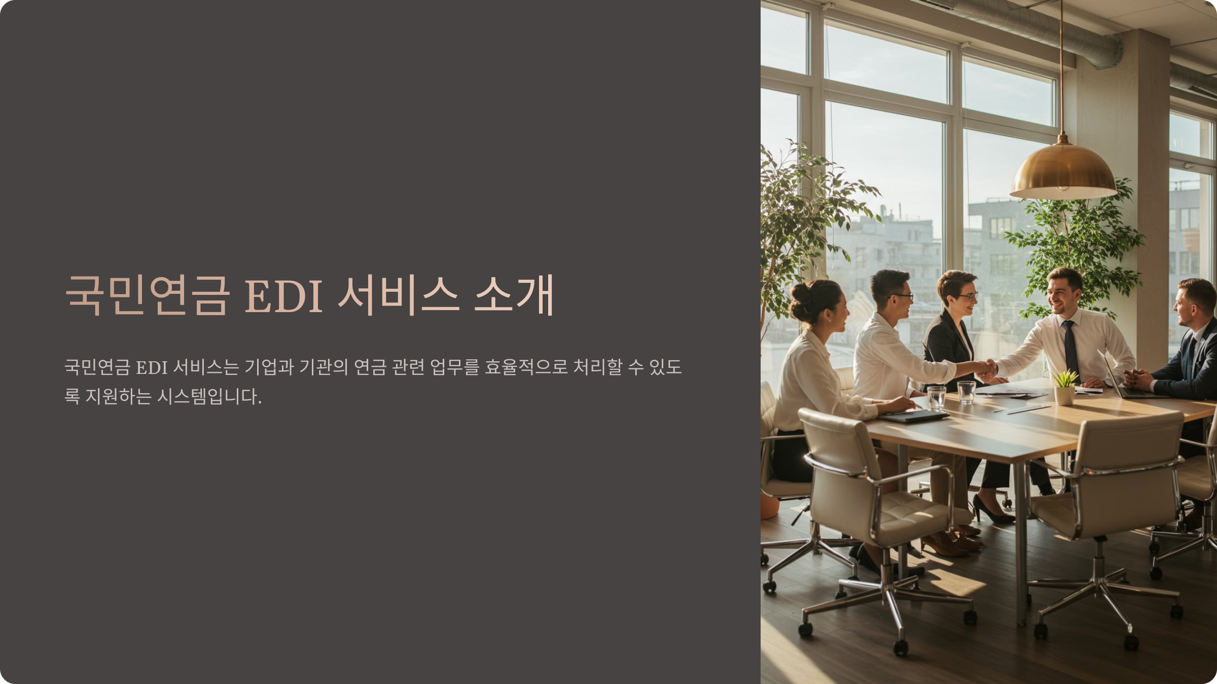국민연금 EDI 서비스는 사업장이 국민연금과 관련된 행정 업무를 더욱 간편하고 신속하게 처리할 수 있도록 제공되는 온라인 기반 전산 시스템입니다. 이를 통해 시간과 비용을 절감할 수 있으며, 업무 효율성이 크게 향상됩니다.