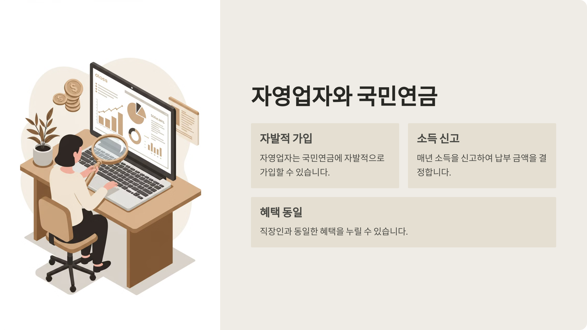 자영업자와 프리랜서는 국민연금 가입과 납부에서 근로자와는 다른 조건과 부담을 가집니다. 하지만 안정적인 노후 준비를 위해 가입은 필수적입니다.