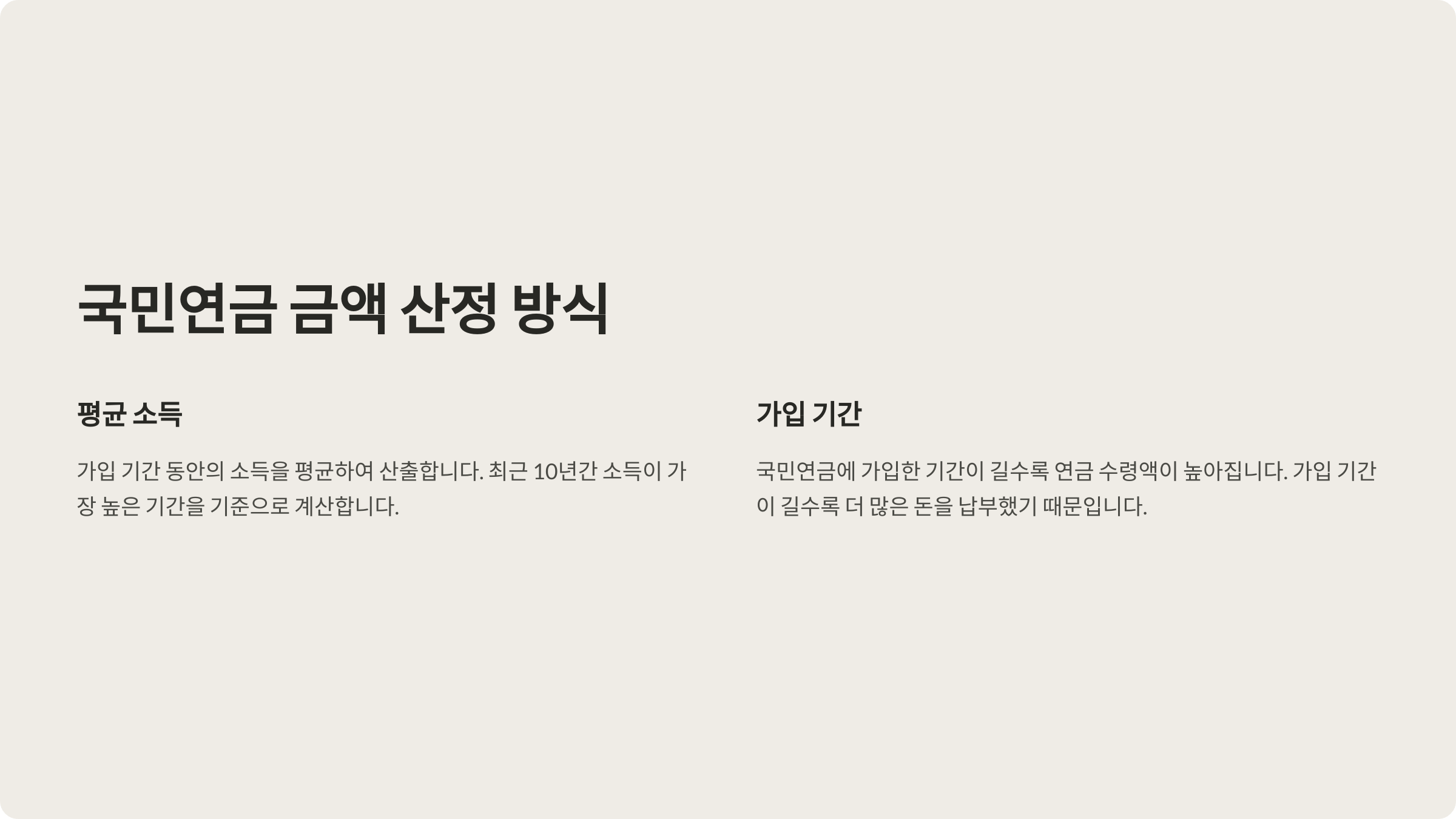 - 기본 연금 외에도 유족연금, 장애연금 등이 제공됩니다.