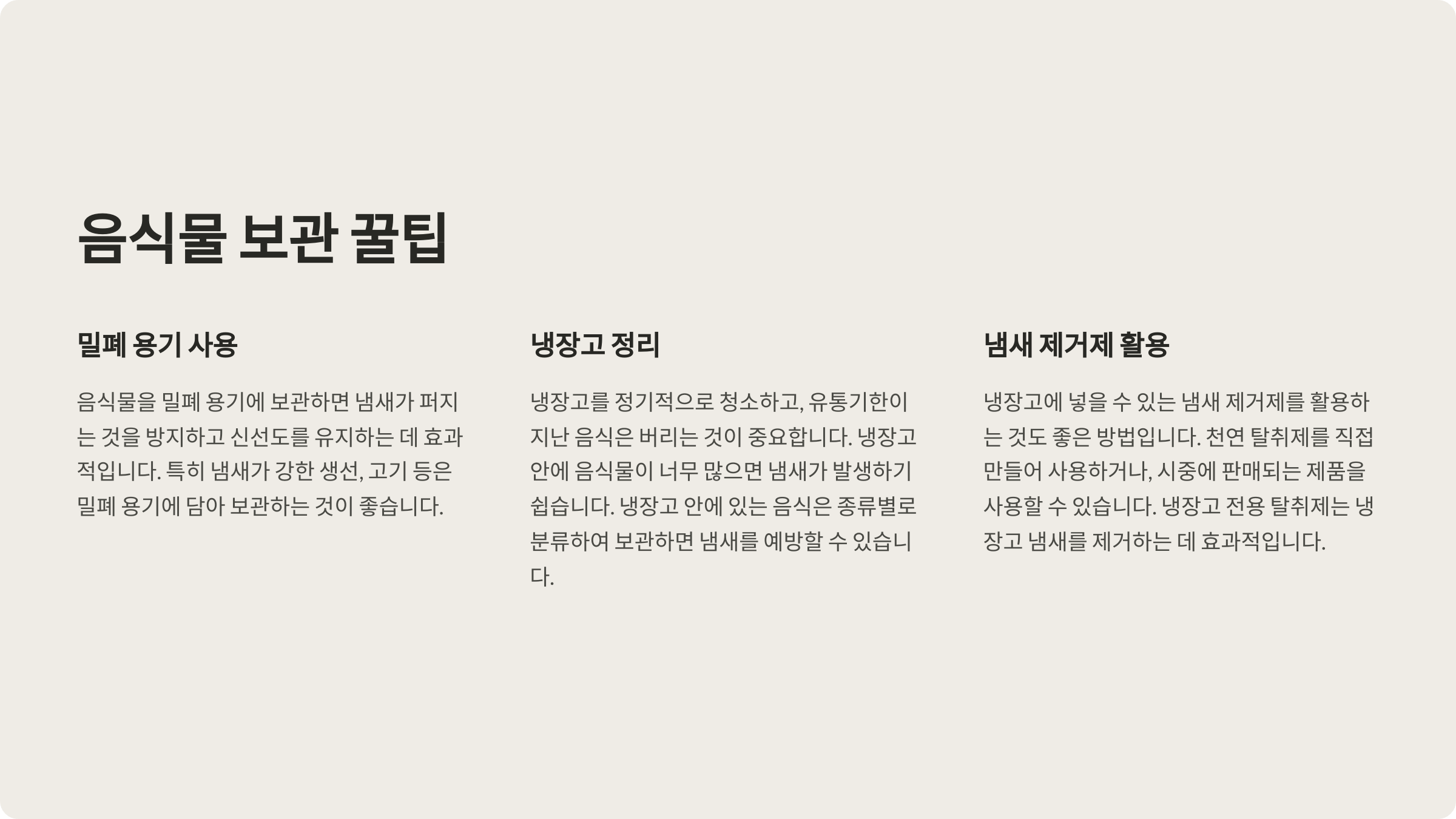 1. **밀폐 용기 사용하기**: 음식물을 개방된 상태로 보관하면 냄새가 쉽게 퍼질 수 있어요. 밀폐 용기에 담아 보관하면 음식의 수분 유지에도 좋고, 냄새 차단에도 효과적이에요.