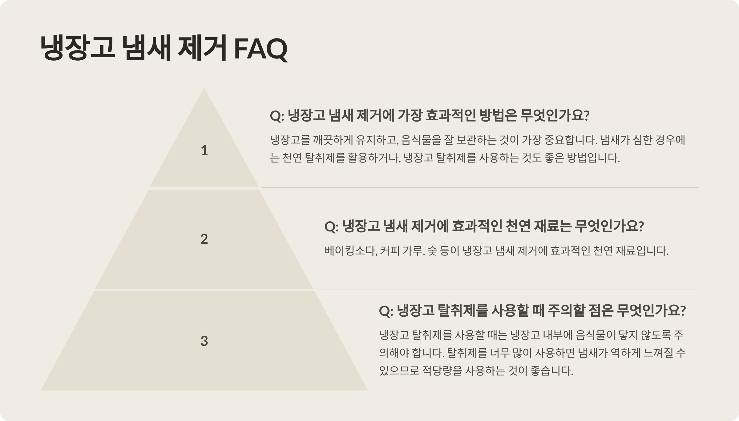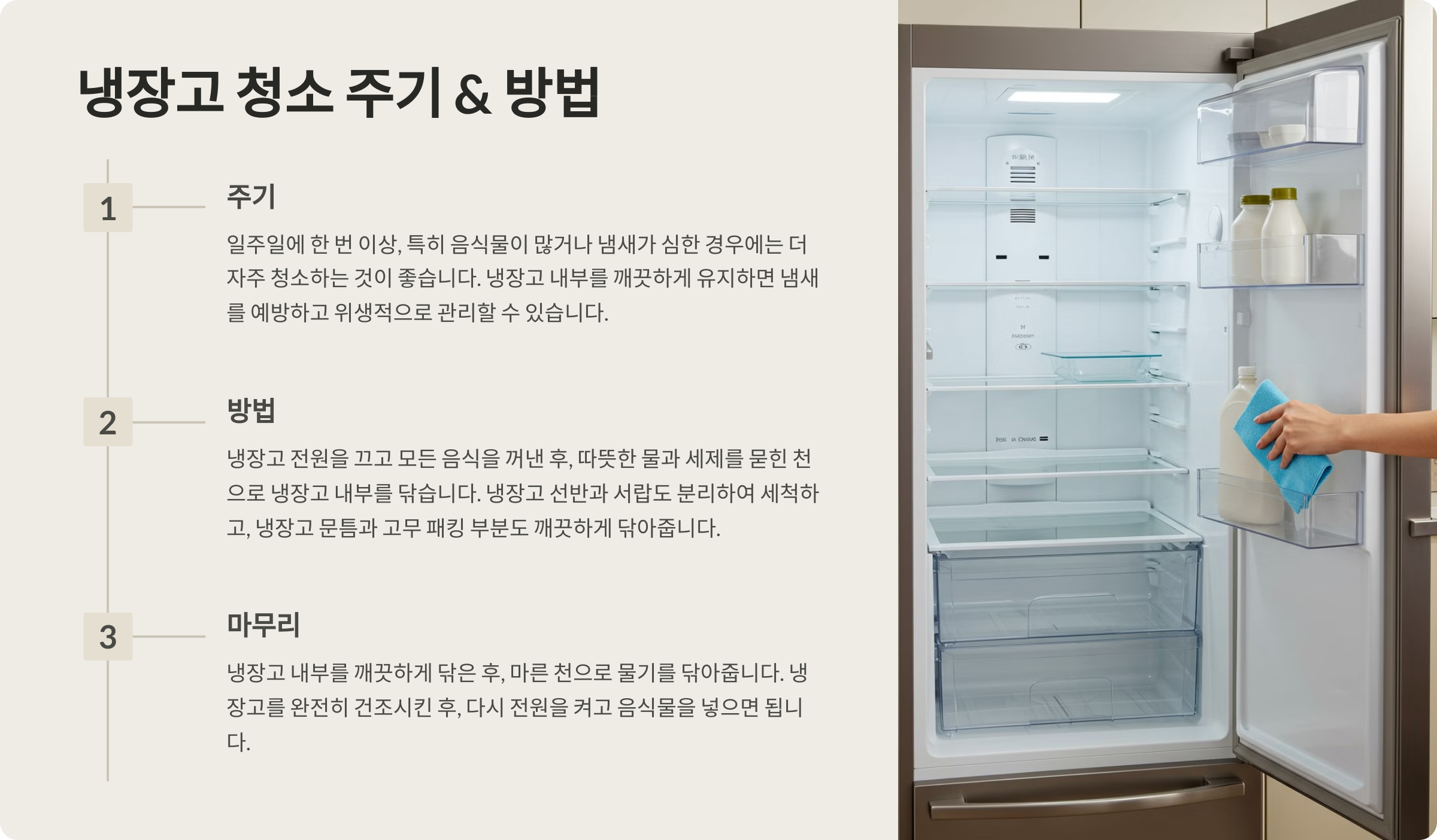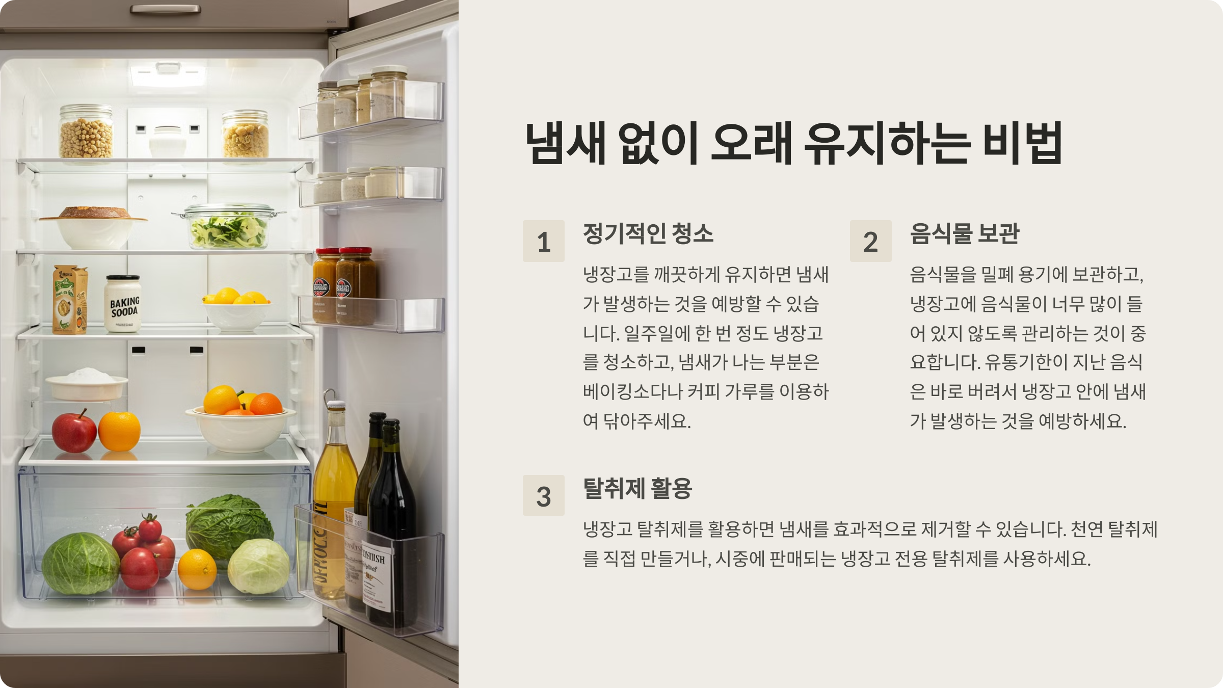 냉장고 냄새 제거의 핵심은 정기적인 청소예요. 보통 2~3주마다 한 번씩 청소하는 것이 좋고, 유통기한이 지난 식재료는 미리 정리하는 습관을 들이면 냄새를 예방할 수 있어요.