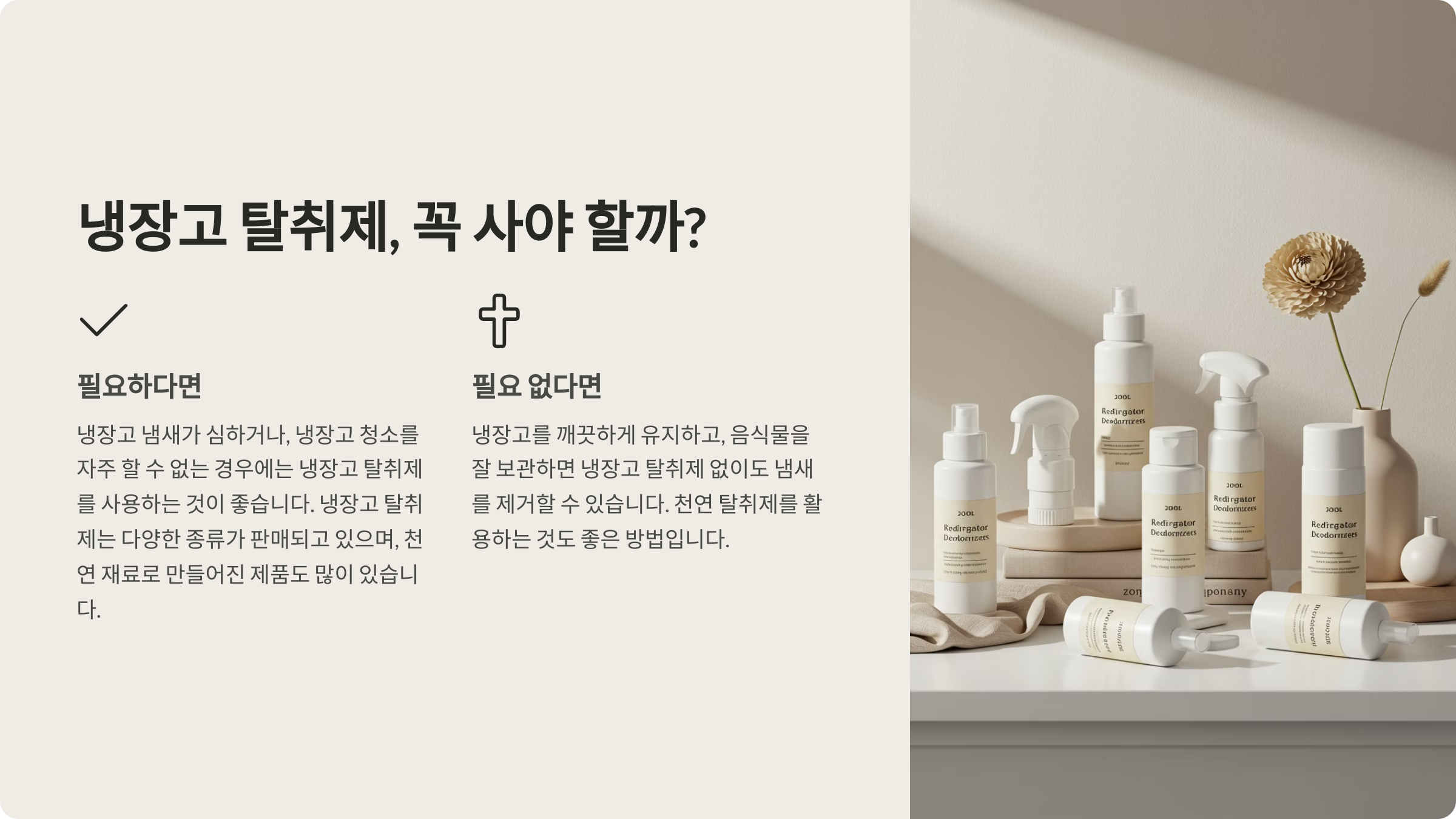 시중에는 다양한 냉장고 탈취제가 판매되고 있지만, 꼭 구매할 필요는 없어요. 앞서 소개한 자연 탈취제만으로도 충분히 효과를 볼 수 있기 때문이에요.