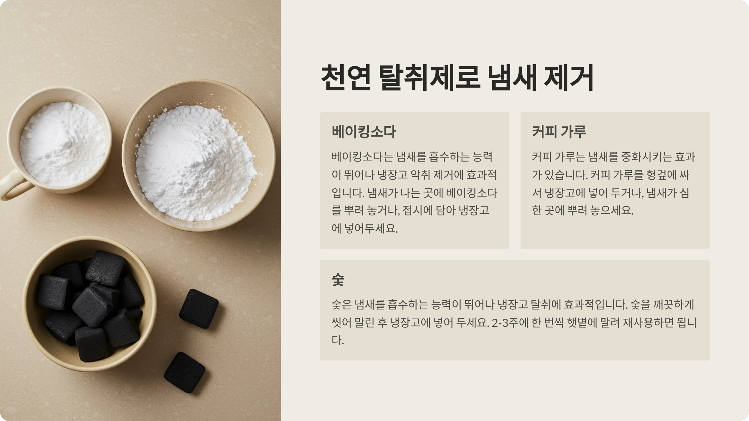 1. **베이킹소다**: 냉장고 안 작은 그릇에 베이킹소다를 담아두면 냄새를 흡수하는 효과가 있어요. 한 달에 한 번씩 교체하면 좋아요.