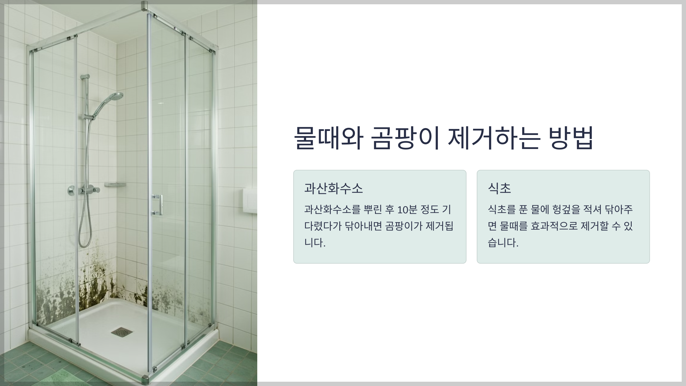 물때 제거에는 식초와 베이킹소다가 효과적이에요. 샤워기, 세면대, 욕조 주변에 생긴 물때는 식초를 적신 천으로 닦아주면 쉽게 제거할 수 있어요. 베이킹소다를 살짝 뿌린 후 문질러주면 더 강력한 세정 효과를 볼 수 있답니다.