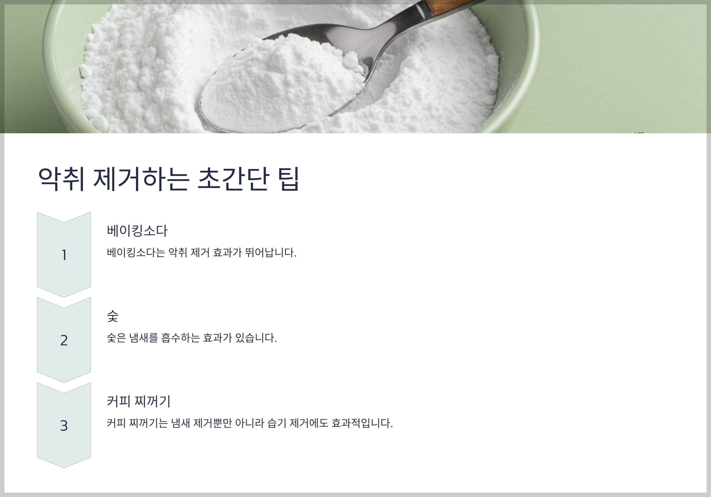 | 베이킹소다 | 찌든때 제거, 탈취 | 타일, 변기, 배수구 |