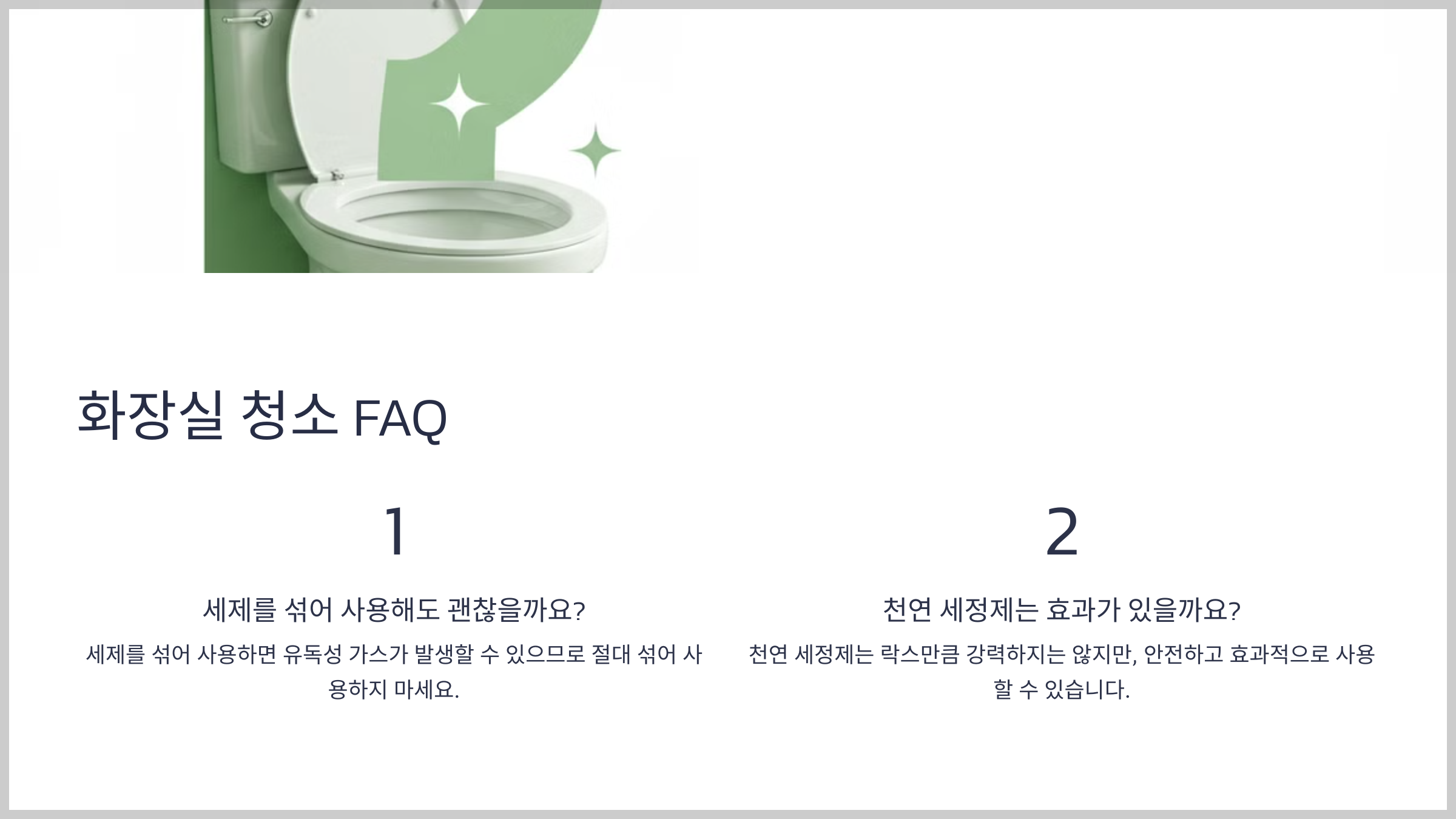 이 조합은 독성이 없고 피부에도 안전해 누구나 쉽게 사용할 수 있어요. 또한 세균과 곰팡이 제거에 효과적이라 화장실을 깨끗하게 유지하는 데 큰 도움이 된답니다.