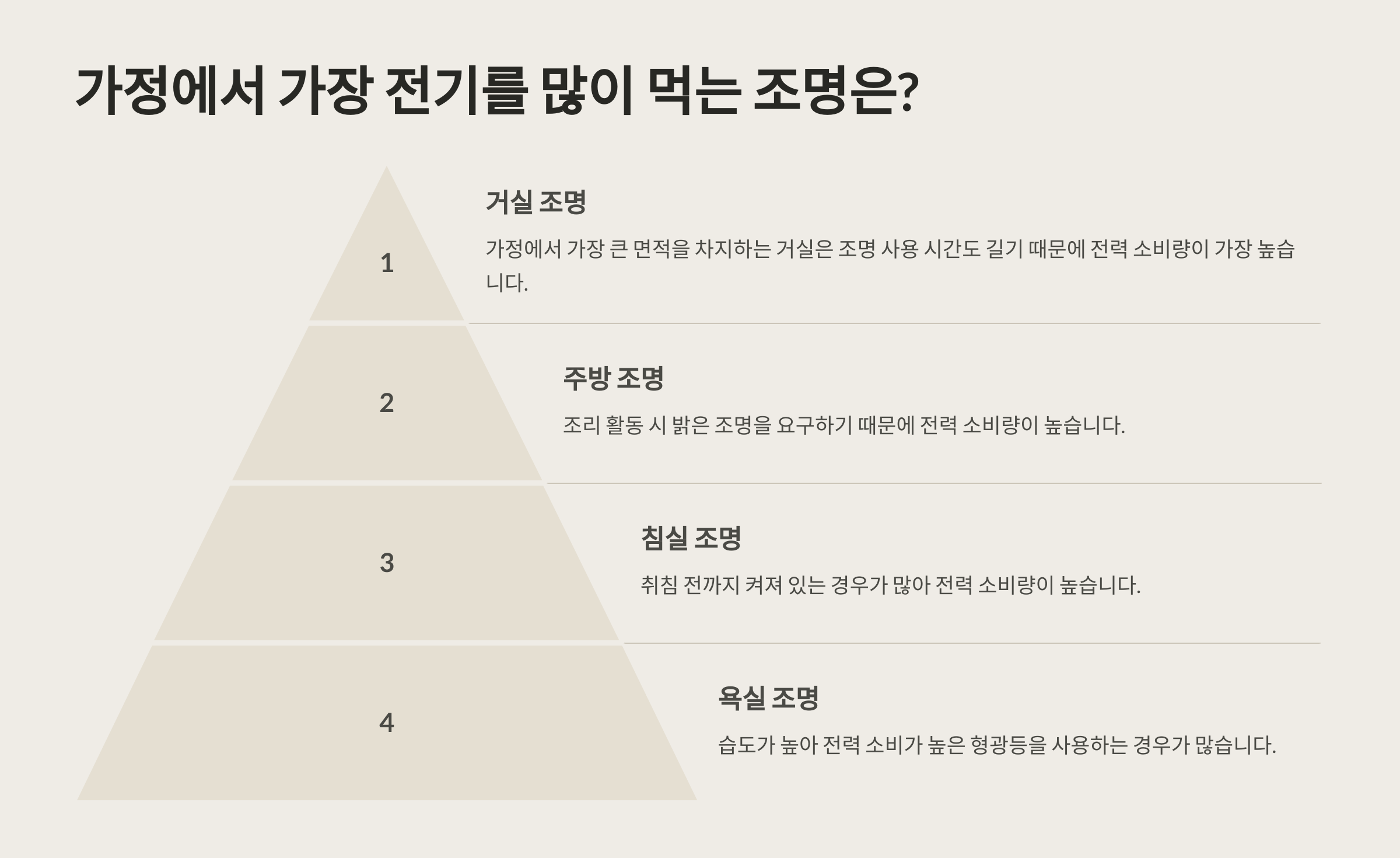 이처럼 가정에서 가장 전력을 많이 소비하는 조명은 거실, 주방, 욕실 조명이에요. 이 공간의 조명을 LED로 교체하고, 필요할 때만 사용하는 습관을 들이면 전기세 절약 효과가 더욱 커질 거예요! ⚡