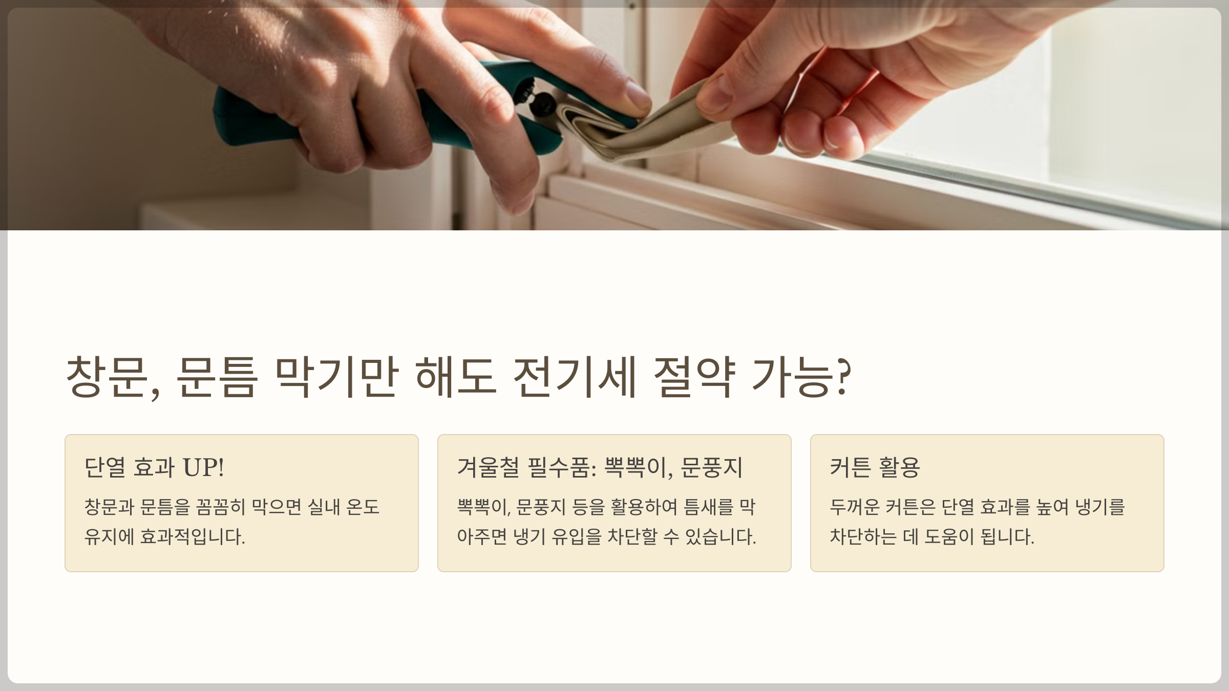 실내 온도가 쉽게 떨어지는 이유는 바로 ‘단열’이 부족하기 때문이에요. 창문과 문틈을 잘 막아주기만 해도 난방 효율이 높아지고 전기세를 줄일 수 있답니다! 🏠🛠