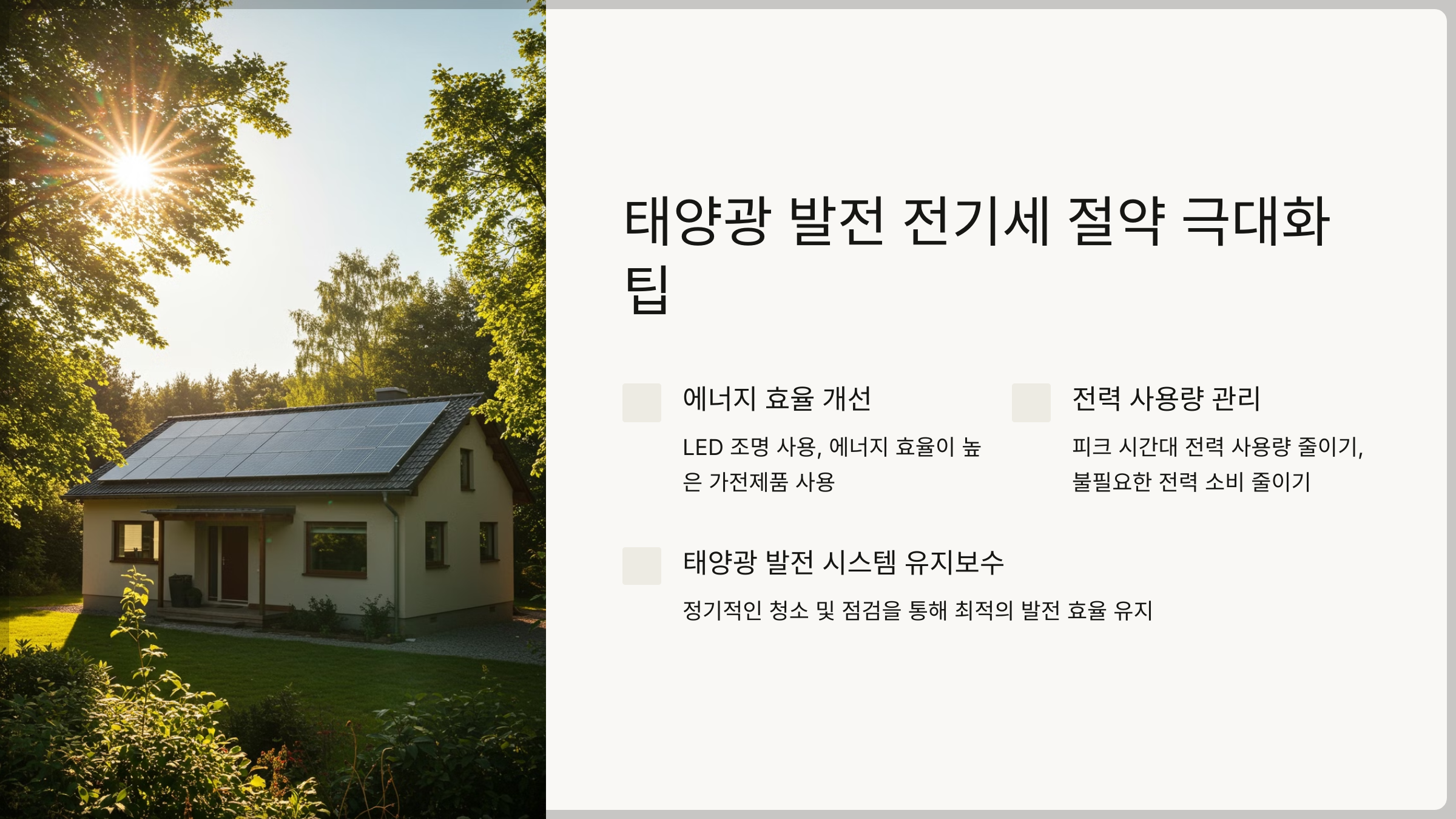 다음으로, 태양광 발전으로 전기세 절약 효과를 극대화하는 팁을 알아볼게요.