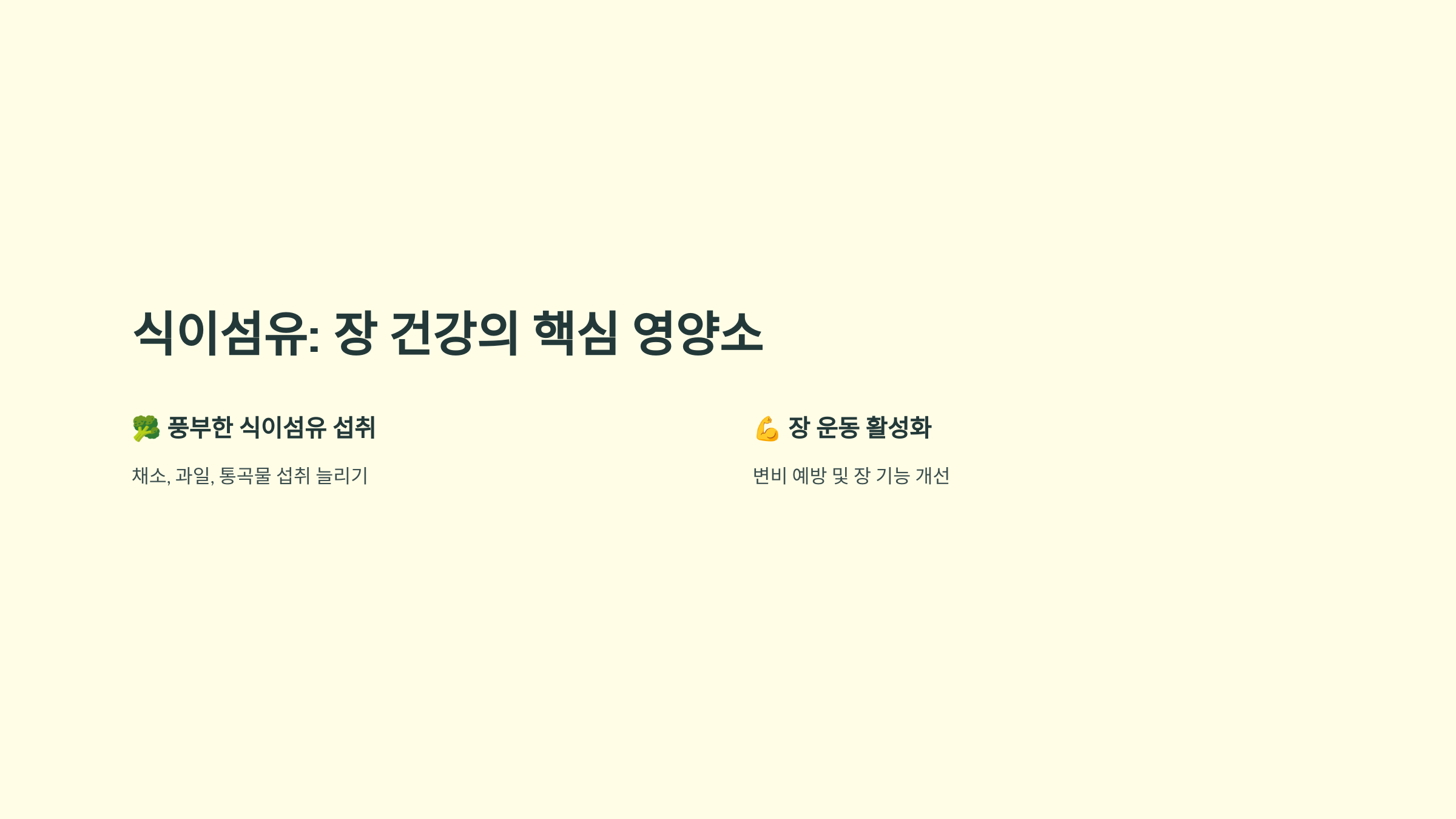 식이섬유는 장 건강을 지키는 핵심 영양소예요. **변비 예방, 장내 유익균 증식, 독소 배출**에 효과적이기 때문에 **매일 충분한 섬유질을 섭취하는 것이 중요해요!**