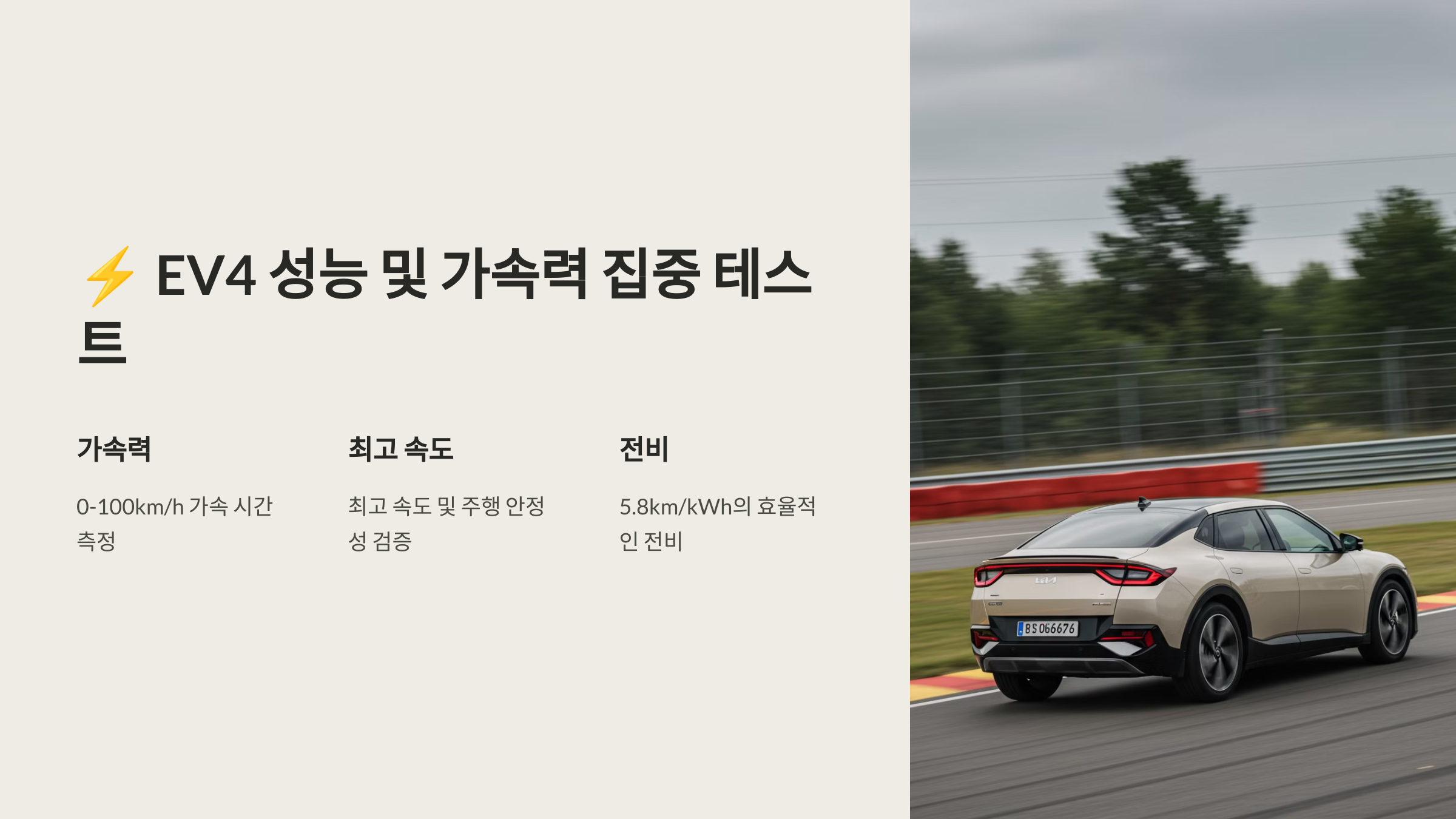 Kia EV4는 **빠른 가속력과 강력한 주행 성능**을 갖추면서도 효율적인 전비까지 고려한 모델이에요. 🚗💨
