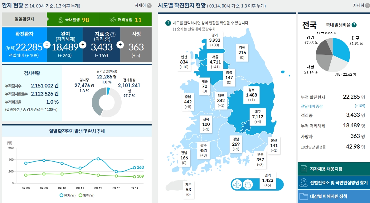 신규 확진자는 109명 늘어난 22,285명으로 집계됐습니다.