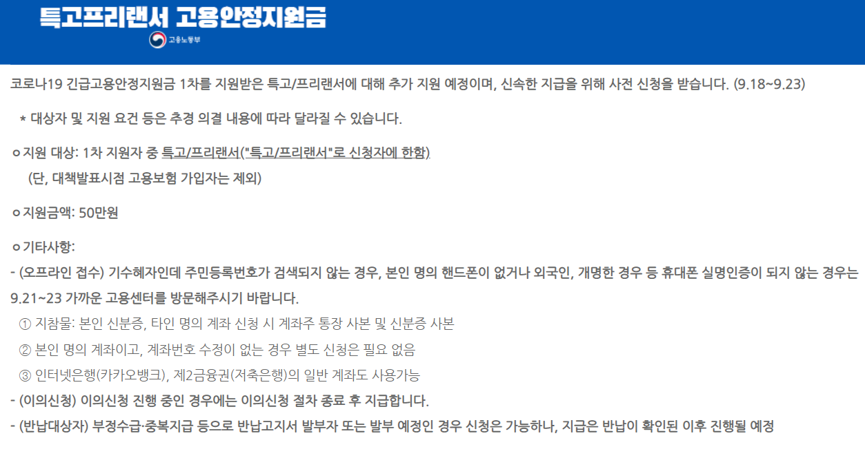 코로나19 긴급고용안정지원금 1차를 지원받은 특고/프리랜서에 대해 추가 지원 예정이며, 신속한 지급을 위해 사전 신청을 받습니다. (9.18~9.23) * 대상자 및 지원 요건 등은 추경 의결 내용에 따라